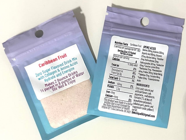 Hydrate and Energize. These mixes have collagen and Amino Acids with no sugar added. These are non-alcoholic drink mixes that taste like you are drinking the real thing. Each packet makes 2 8oz glasses. Just put half the packet in water, mix and enjoy the sweet flavor with little calorie intake. Add ice, blend in a mixer, add additional mixes if desired.